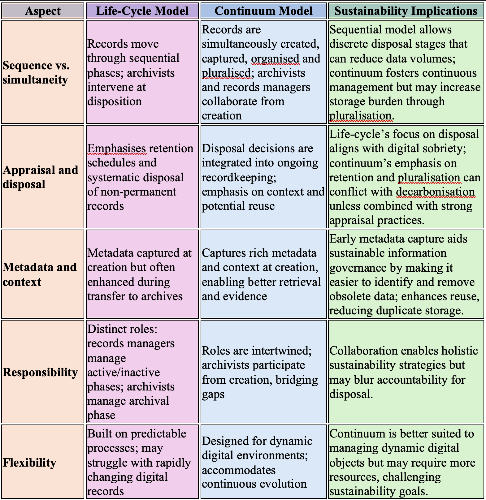 The life‑cycle and continuum models offer valuable frameworks for managing records, yet neither alone fully addresses the environmental challenges posed by the digital age. The life‑cycle model’s emphasis on disposal and retention schedules aligns with digital sobriety, but its late archival intervention can leave digital records vulnerable to obsolescence. The continuum model better reflects digital realities and encourages rich metadata capture but risks increased storage and energy consumption. By integrating sustainable practices—data minimization, metadata enrichment, tiered storage and user education—records professionals can adapt both models to support digital sustainability and sobriety goals. Ultimately, a hybrid approach that harnesses the strengths of each model while prioritizing environmental responsibility offers the most promising path forward.